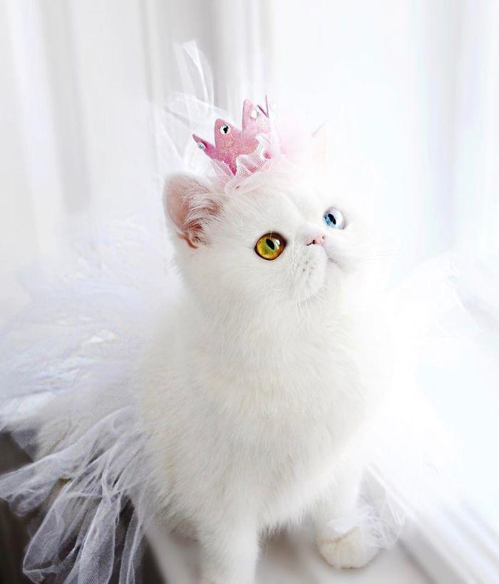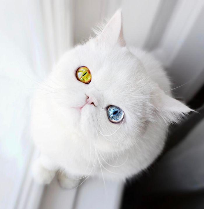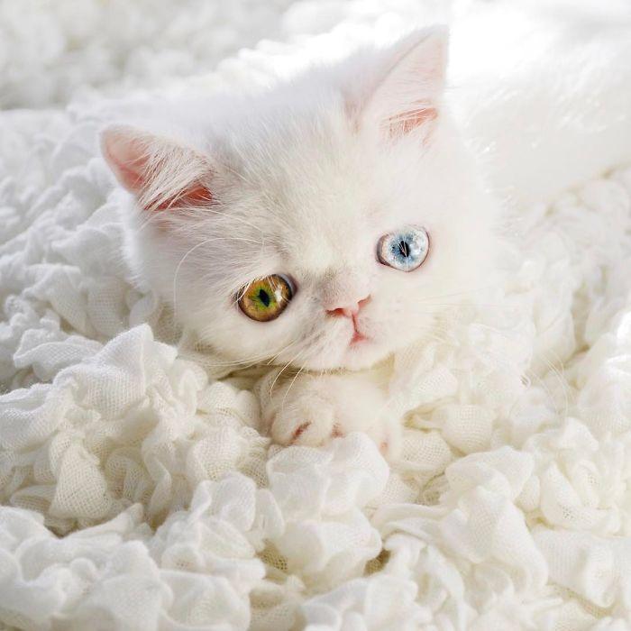 Знакомые владельцев этого котенка поговаривают, что если вовремя не успеть отвести взгляд, можно попасть под чары этих разноцветных глаз и утонуть в них. Глаза у кошечки и впрямь завораживают — как своей красотой, так и необычным сочетанием цветов. Это явление именуют гетерохромией и у животных оно встречается столь же редко, сколь у людей.