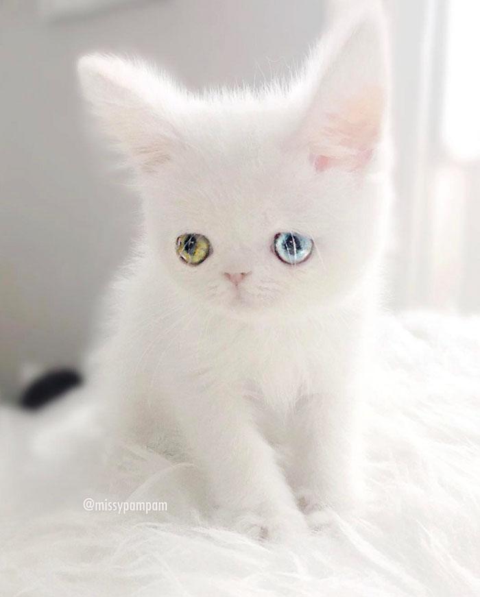 Причины разного цвета глаз у Пам Пам не озвучиваются, но очевидно, что выбрали ее неспроста. Например, среди поклонников породы «турецкая ангора» гетерохромия неофициально считается «тем самым» признаком чистокровности зверя. И кошек с разными глазами стараются культивировать, чтобы закрепить это свойство в потомстве. Пам Пам пока принудительная случка с гетерохромным собратом не грозит — она еще слишком маленькая.