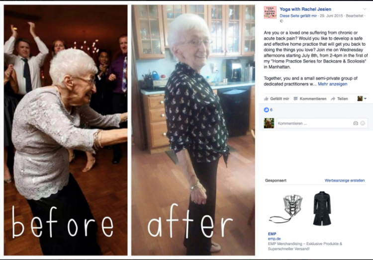 Рэйчел сама страдала от болей в спине и потому увлеклась йогой. А затем стала инструктором. Девушка стала навещать пожилую женщину и показывать ей различные упражнения для улучшения осанки и укрепления мышц спины.
