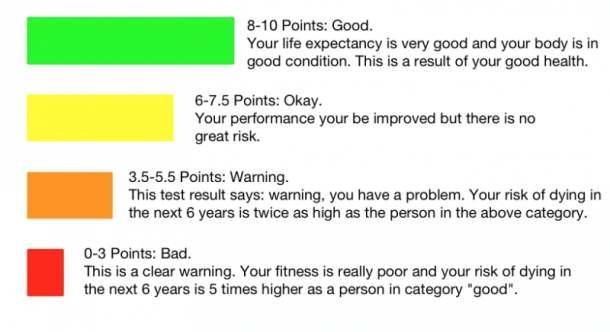 • 0 — 3 очков: плохо. Серьезное предупреждение. Ты в очень плохой форме, и риск умереть в последующие 6 лет у тебя в 5 раз выше, чем у человека из категории «хорошо».