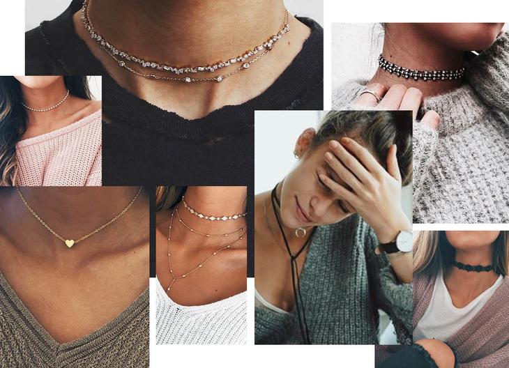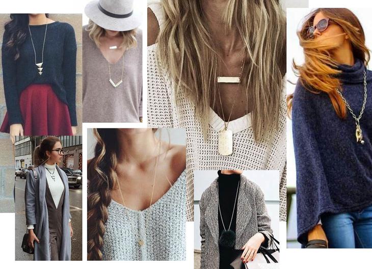 Тонкие цепочки с кристаллами или миниатюрными кулонами смотрятся особенно нежно и женственно на фоне объемного трикотажа. Носите два тонких чокера одновременно или сочетайте один с длинной цепочкой. Не имеет значения, выберете ли вы свитер с круглым вырезом или V-образным, все комбинации украшений будут уместны.