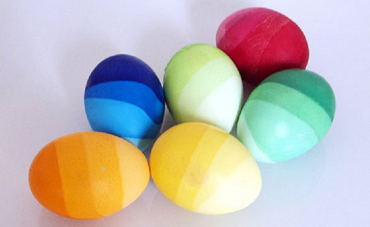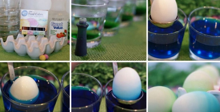 Свари яйца и подготовь в небольшой емкости краситель. Постепенно опускай яйца в раствор всё глубже и глубже. Таким образом ты получишь плавный переход от темного оттенка до светлого.