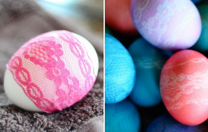 Очень простой способ подарить крашенкам изысканный узор. Обмотай яйца кружевом и свари в красителе. Затем промой в прохладной воде и сними ткань. Такие яйца здорово украсят твою пасхальную корзинку.