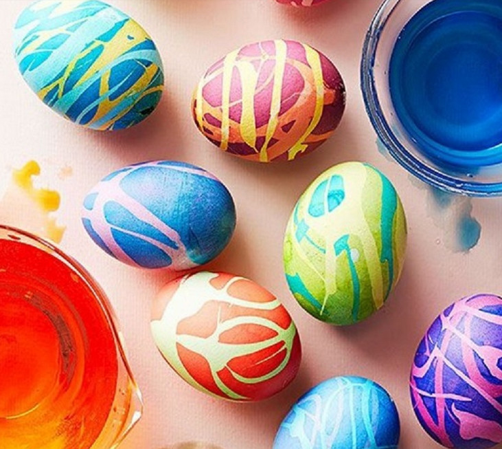 Покрась яйца в нежный базовый цвет. Подожди, пока они полностью высохнут. Возьми свечу и изобрази горячим капающим воском разные узоры. Теперь опусти яйцо в насыщенный цвет. После окрашивание подогрей немного яйца в теплой воде, чтобы с легкостью убрать воск.