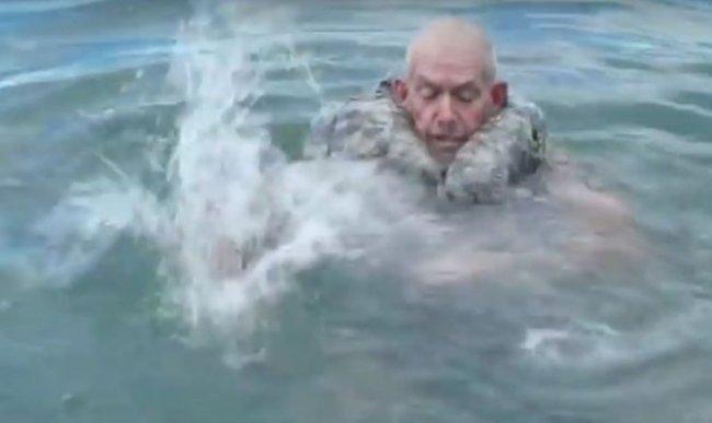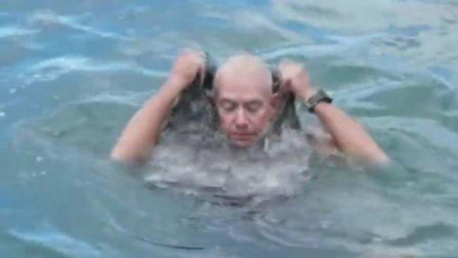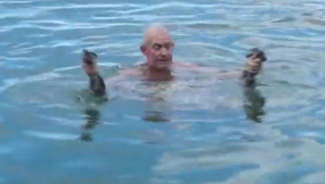 Всё, что осталось сделать, — это ударять ладонью по воде. Таким образом воздух попадет внутрь штанин и накачает их, они будут похожи на спасательный жилет.
