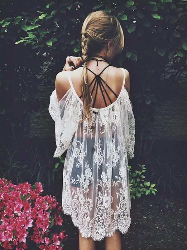 Белое кружевное платье с V-образным вырезом – отличный вариант для летнего зноя. Крой мини выглядит соблазнительно. А нежный цвет освежает!