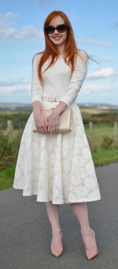 Кружевная светлая блуза и пышная юбка-миди создают элегантный образ. В таком наряде на любом торжестве соберешь множество комплиментов!