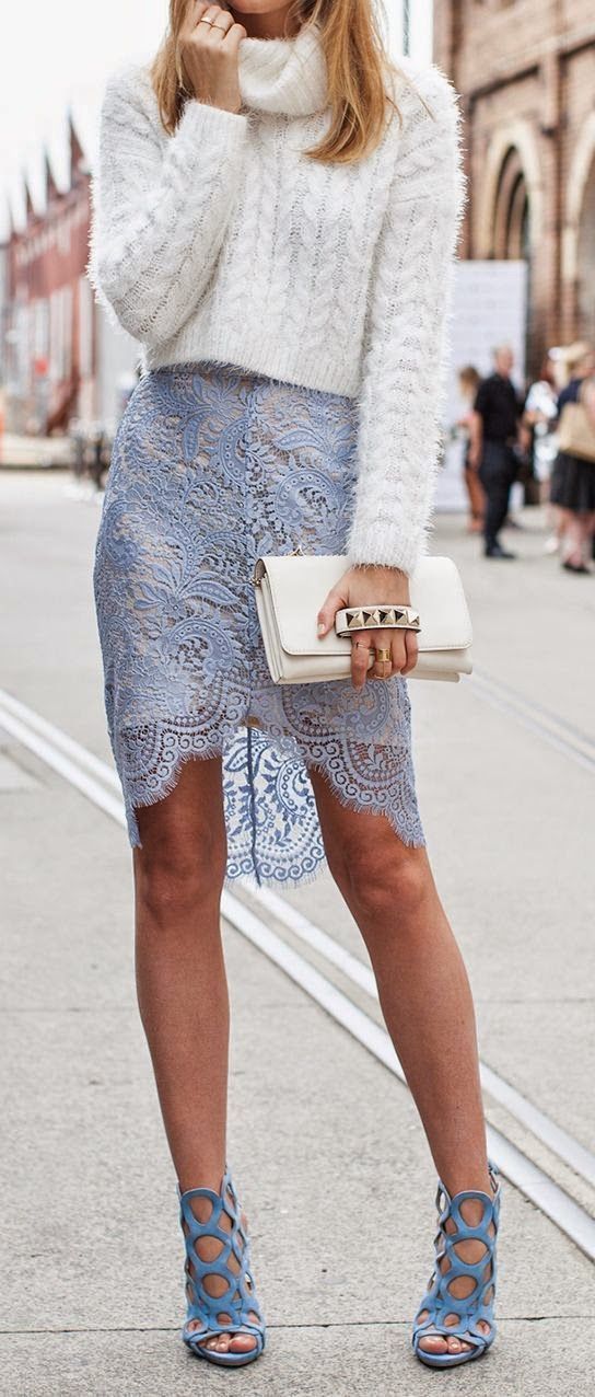 Сочетание белой махровой ткани пуловера и голубого кружева смотрится свежо и стильно. Такой вариант идеален для прохладных вечеров!