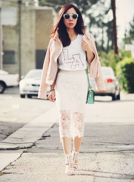 Белая кружевная миди-юбка отлично комбинируется с повседневными вещами. Особенно в пастельных тонах – розовый, мятный, молочный.