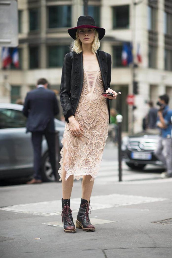 Кружевное платье трендового нюдового оттенка идеально впишется в уличный стиль. Дополнить его можно блейзером, шляпой и грубыми ботинками.
