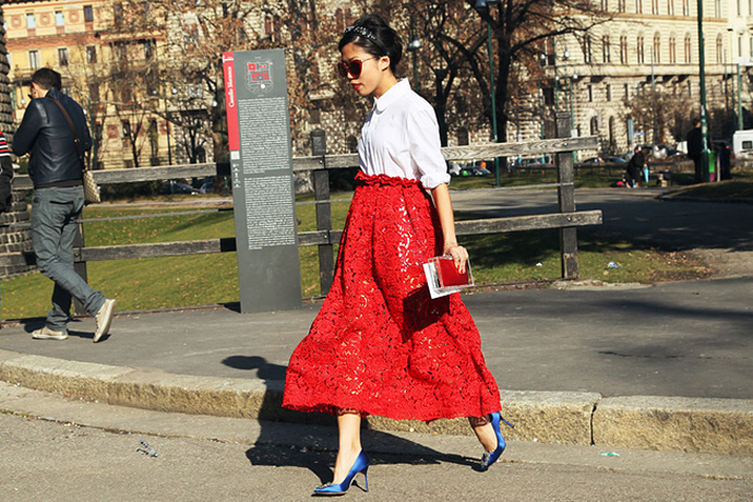 Красная миди-юбка из кружева – лучший акцент для образа! Дерзкая и красочная вещь станет изюминкой аутфита.