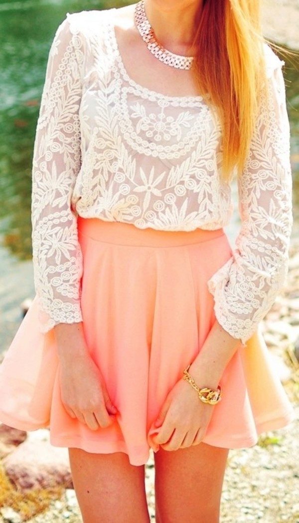 Нежная блуза молочного оттенка – идеальное дополнение для персиковой юбки. Получается скромный, нежный и романтичный аутфит.