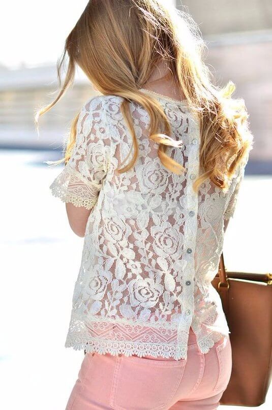 Белая блуза из кружева – основа женственного образа. Короткие рукава – еще и практично в летний зной. Лучший вариант для свидания и прогулки!