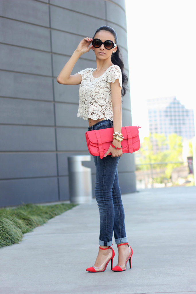 Кроп-топ из белого кружева – великолепное дополнение к джинсам и брюкам с завышенной талией. Одновременно стильно и дерзко!