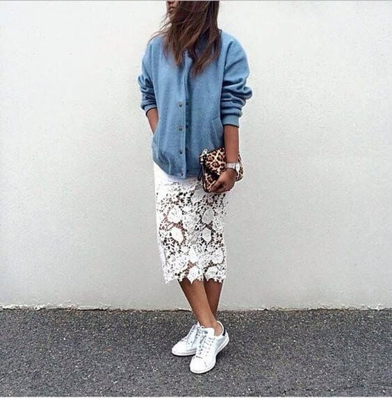 Кружевная юбка идеально дополнит летний кэжуал-образ. Наряд можно дополнить обычными кедами и джинсовой курткой-бомбером.