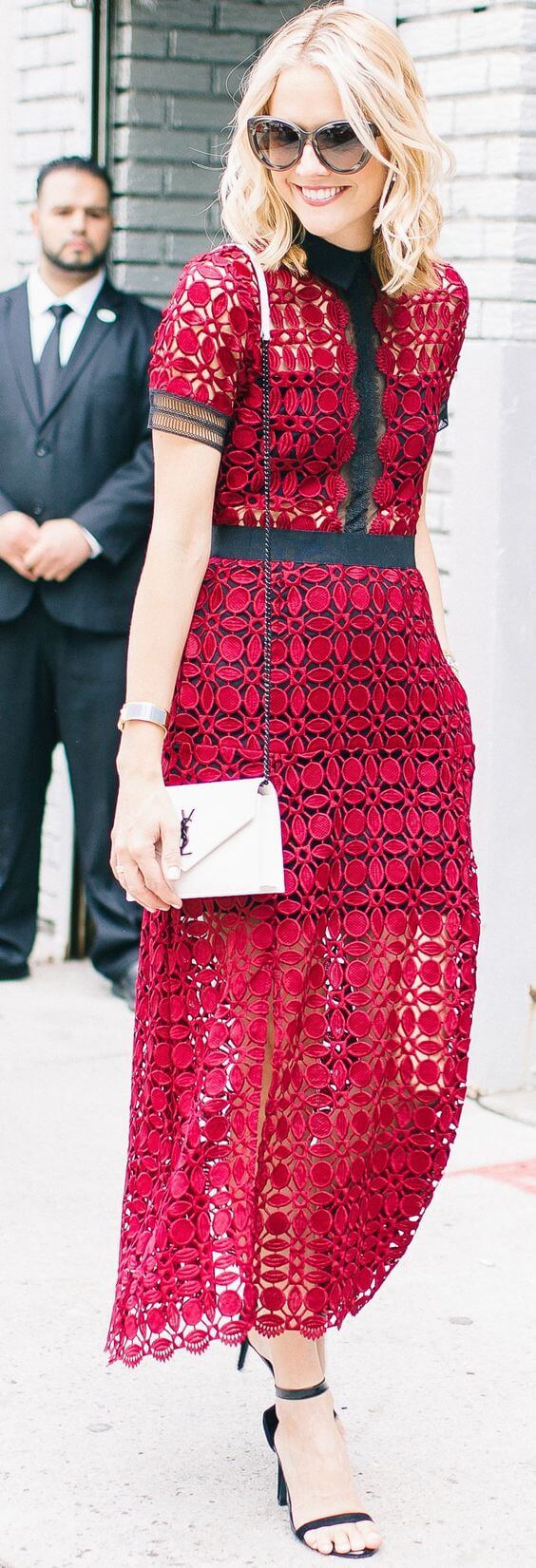 Геометричное красное кружево на платье – прекрасный выбор для офисного наряда. Смотрится празднично, но при этом элегантно и немного строго.