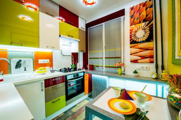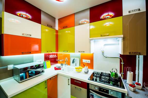 Гарнитур установлен буквой “Г”, с ярко-зелёными и оранжевыми фасадами;