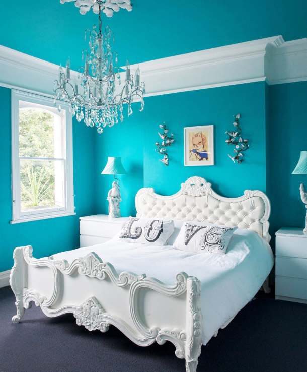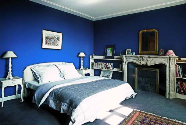 Ярко-синий в комнате создает ощущение прохлады и воды.
