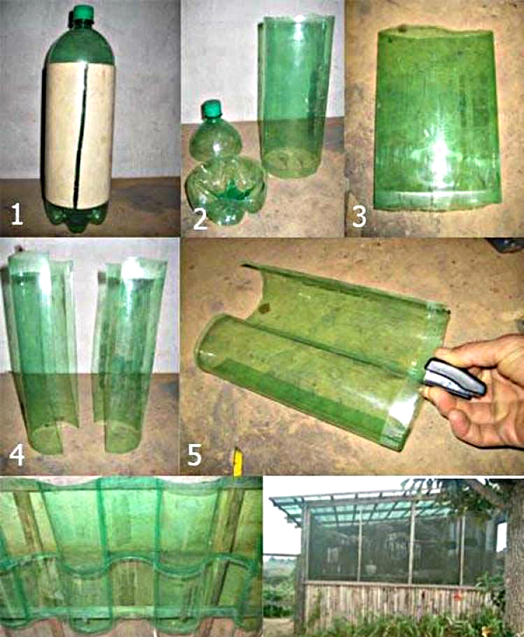 А вот как можно сделать бутылочную черепицу: сначала срежь горлышко и дно, затем разрежь цилиндр. Скрепи заготовки строительным степлером.