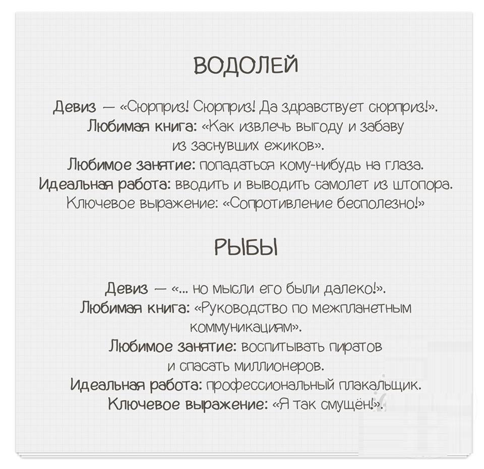 Яркие и смешные характеристики знаков Зодиака! Просмотров: 6513 Загрузка... Читайте также: Классификация врачей. Ничего смешнее в жизни не читала! Загрузка... 1 2 НРАВИТСЯ ПОДЕЛИТЬСЯ Ваши друзья сейчас читают Дачные королевы, которые вытворяют какую-то дичь! Люблю девушек-«компьютерщиц», они неверояно креативны в жизни! Этот клип рвет душу на кусочки — «А нам сегодня 50» Одна из лучших на сегодняшний день песен! Рождество — Ты знаешь, так хочется жить