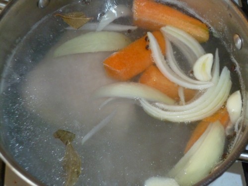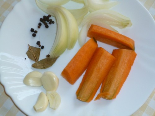 Чеснок (2-3 зубка) разрежем пополам, чтобы он лучше отдал аромат. Лук и морковь тоже нарежем крупными кусочками.