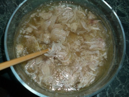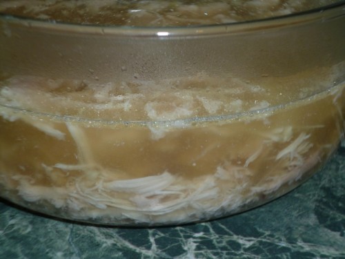 Когда холодец слегка загустел, я аккуратно перемешиваю его, чтобы мясо распределилось равномерно.