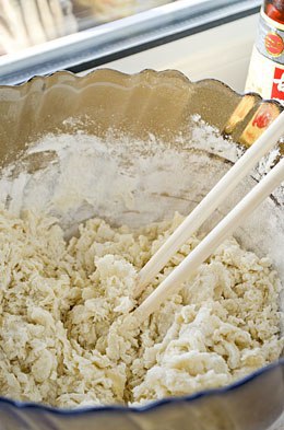 Просеиваем муку в миску. Добавляем соль, кунжутное масло и кипяток и очень быстро замешиваем тесто, быстро размешивая смесь деревянной ложкой (палочками), пока вся мука не намокнет.