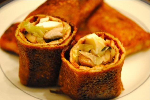 Даже обычные блины можно превратить в праздничное блюдо. Нарежьте 250 г копченой семги маленькими ломтиками. Смажьте блины сыром маскарпоне и нежной горчицей. Капните пару капель лимонного сока. Посолите и поперчите. Затем заверните блины.