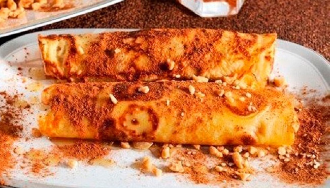 Взбейте в блендере 3 нарезанных банана и 50 г сливок. Сверху блины присыпьте какао-порошком, корицей или растопленным шоколадом.