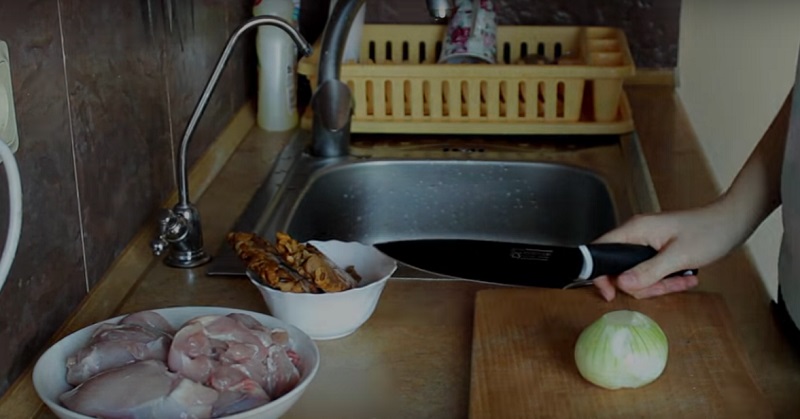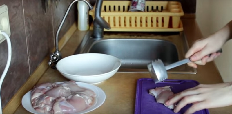 1.Нарежь куриное филе на тоненькие ломтики и отбей хорошо молотком. Тщательно промой каждый кусочек.