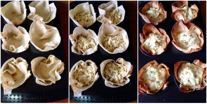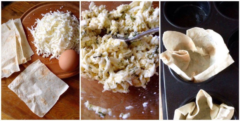 Количество ингредиентов зависит от того, сколько корзинок вы будете готовить. У меня форма на 6 штук. Использовала один лист лаваша, одно яйцо и грамм 100 адыгейского сыра.