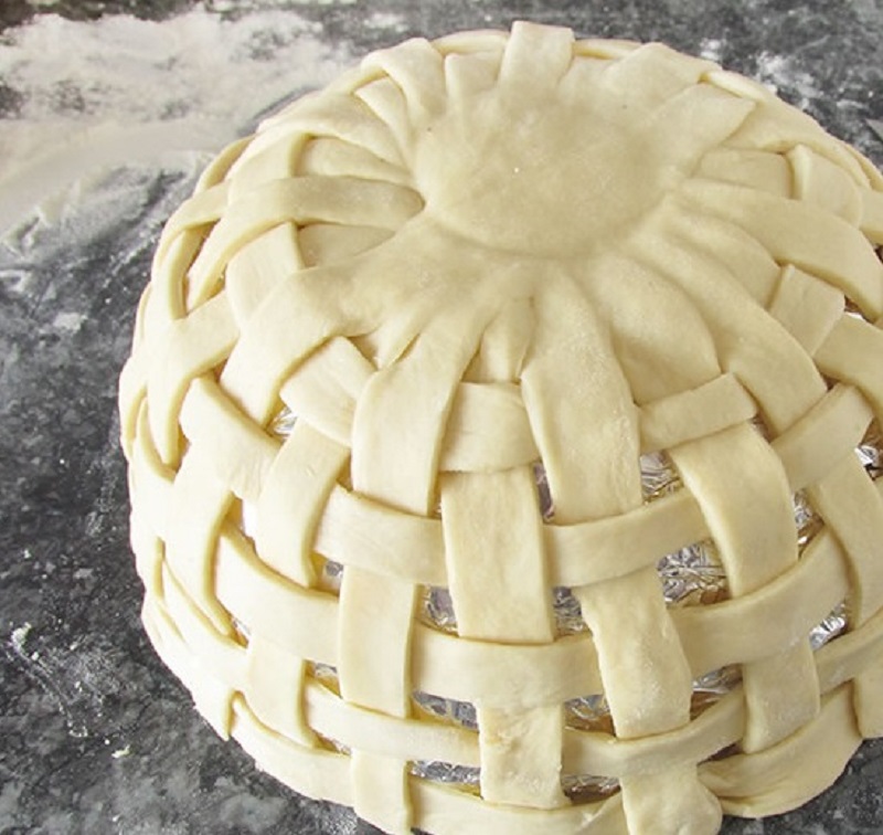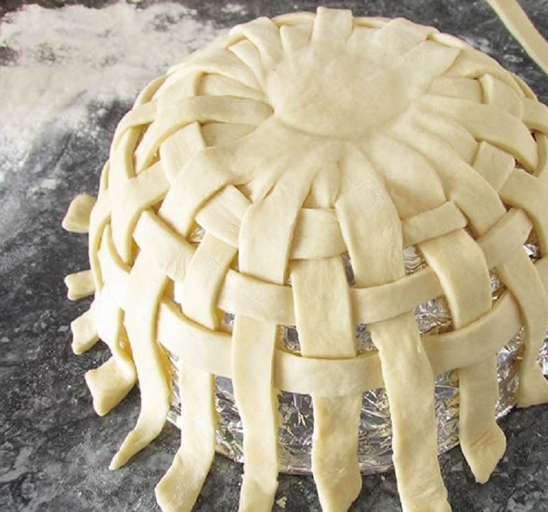 7. Возьми половину оставшегося теста. Раскатай его в пласт такой же толщины и точно так же разрежь на полоски. Вплети горизонтально получившиеся полоски в те, что уже разложены на миске. Поочередно пропускай их над и под вертикальными полосками. В месте, где вертикальные полоски перекрещиваются, образуется толстый слой теста. Прижми его стаканом, чтобы сформировать дно корзинки.