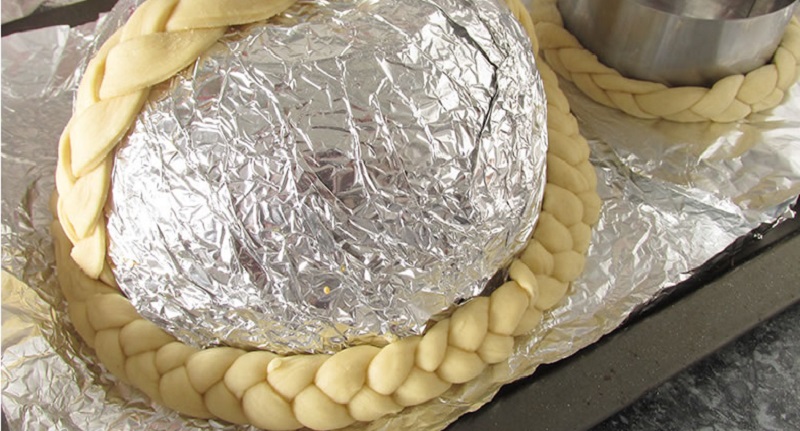 13. Теперь надо сформировать ручку, верхний ободок и дно корзинки. Миску снова оберни фольгой. Оставшееся тесто раскатай в пласт, разрежь его на девять полосок. Сплети три косички. Выложи их, как показано на картинке.