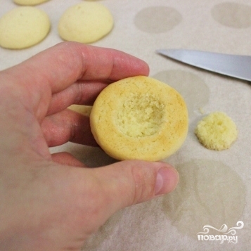 4. Когда печенье остынет с плоской стороны острым маленьким ножом вырезать середину для начинки, эту часть не выбрасывать, она пригодится.