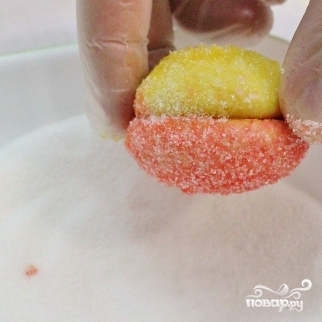 7. Взять три блюдца, в одно насыпать сахар, в два другие — подкрашенное молоко. Опускать половинки в молоко затем в сахар, окрас можно регулировать самим.