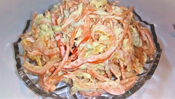 Простой салат на каждый день или на праздничный стол. Готовиться быстро — ничего варить не надо. Попробуйте — очень интересный салат.