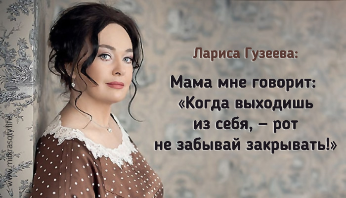 Лично я согласна почти со всеми её высказываниями! Мудрая женщина! Ларису Гузееву многие знают по фильмам «Жестокий романс», «Соперницы», «Встретимся в метро», «Приключения Шерлока Холмса и доктора Ватсона: Двадцатый век начинается». Но настоящую славу ей принесло телешоу «Давай поженимся», кторое вот уже на протяжении многих лет не теряет своих рейтингов в просмотрах. Актриса очень часто даёт советы женщинам и и колко шутит. Но все её фразы всегда точны и уместны.