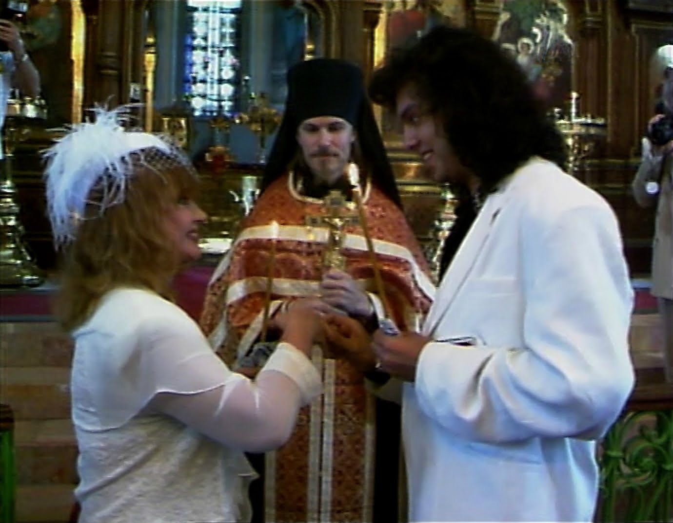 Алла Борисовна выбрала для церемонии красивое нежно-розовое платье и такого же цвета фату, ее супруг был одет в классический костюм. А храм был украшен белоснежными цветами.