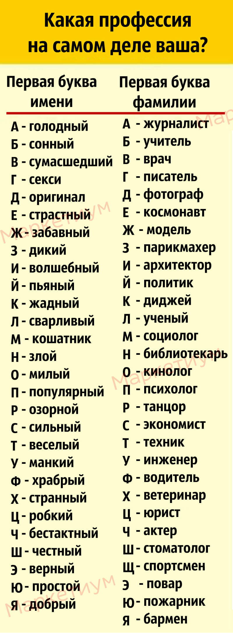 Говорят, что имя — не пустой звук и имеет скрытое, внутреннее влияние на жизнь человека. Как говорил когда-то капитан Врунгель: “Как вы яхту назовете, так она и поплывет”. Можно верить этому, можно не верить, а можно убедиться в справедливости того или иного на собственном опыте. По мнению некоторых ученых, первая буква имени дает определенную черту характеру и склонность к определенной профессии. Но поскольку сейчас у нас есть не только имя, но и фамилия, то свою силу имеет и она. Найдите свои начальные буквы и узнайте, кем вам суждено стать, и каким качеством вы будете при этом наделены.
