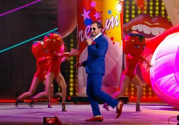 В гламурности нельзя отказать и Александру Ревве. Его красные лаковые ботинки были видны, наверное, с самых дальних рядов зала. А девушки с клубничкой вместо головы, бегающие по сцене, привнесли особую пикантность в его выступление.